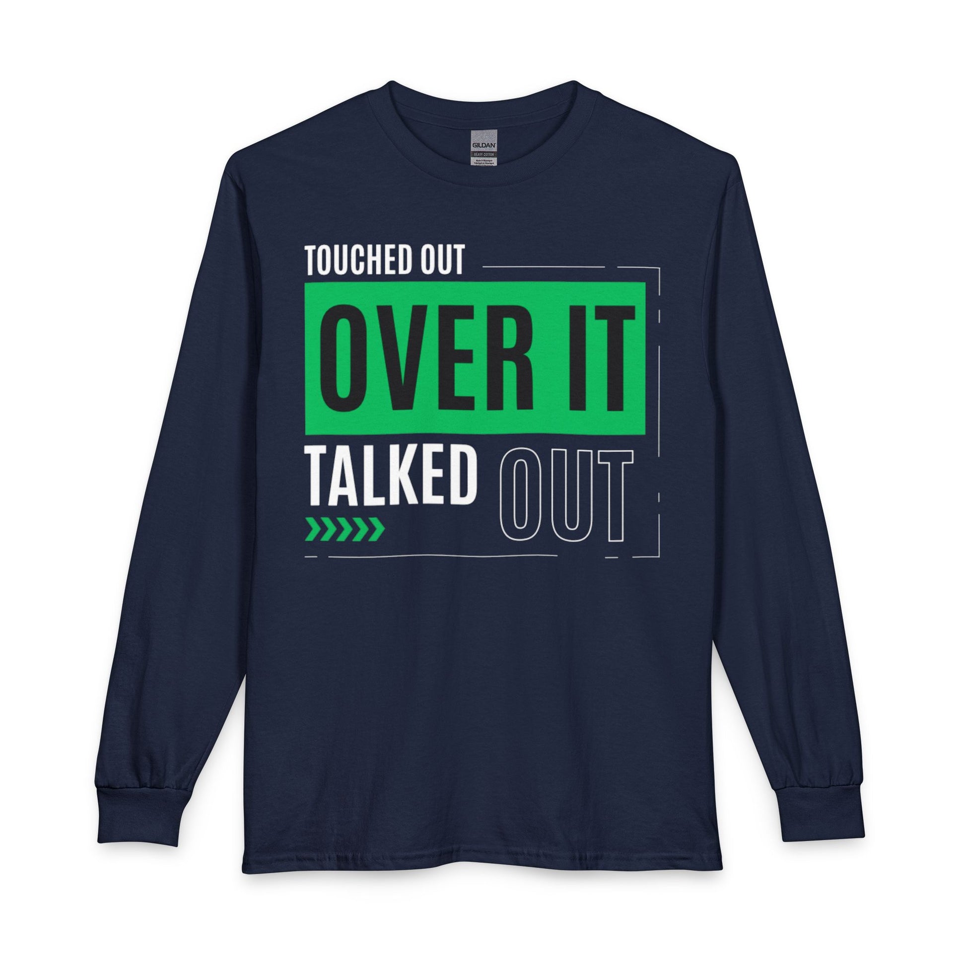 A bold long-sleeve tee that speaks with honesty and a little edge. The front print layers strong typography — “TOUCHED OUT” and “TALKED OUT” framing a bright green, stamped “OVER IT” — giving this shirt a confident, no-nonsense voice. Wear it on days when you need to set a boundary, lighten the mood with wry honesty, or simply show you’ve moved past the drama. The breathable 100% cotton feels smooth and sturdy, while ribbed cuffs and a wide collar keep the silhouette classic and comfortable. It sits like a reliably casual staple in a closet, ready for walks, coffee runs, group hangouts, or low-key protest signs—an everyday statement piece for people who prefer clarity over small talk.